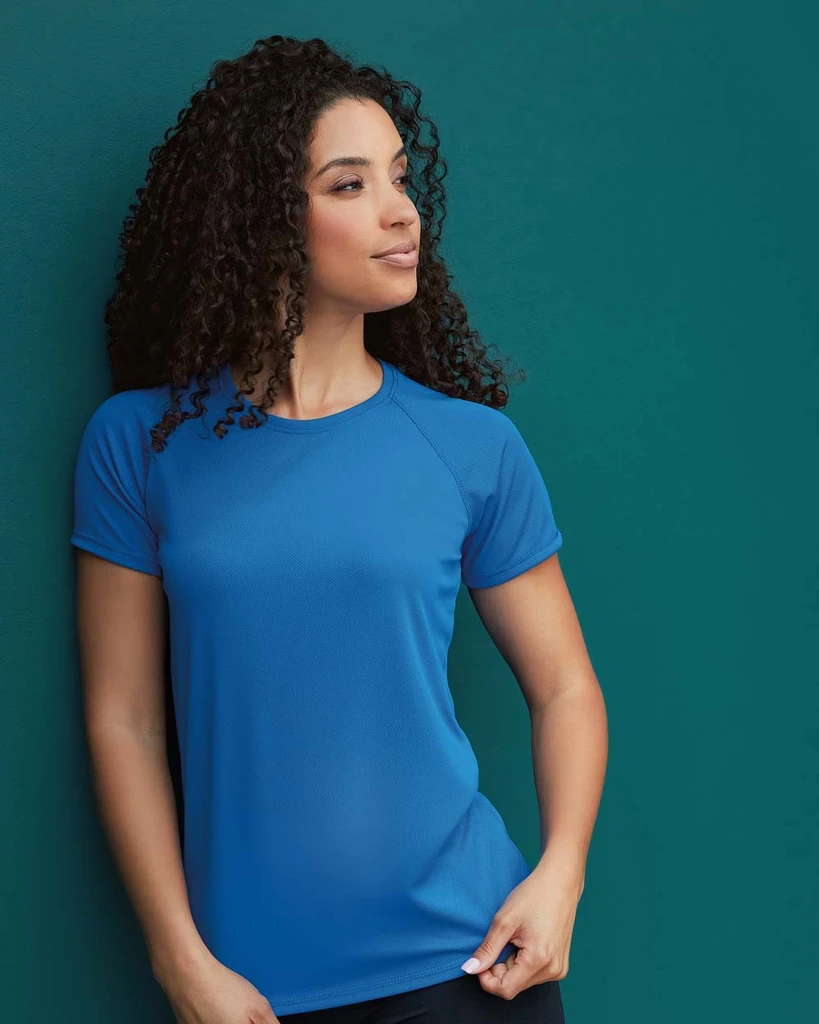 Material: 100% ACTIVE-DRY° polyester; bird-eyelet mesh; Weight: 140 gsm; Bird-eyelet mesh, ACTIVE-DRY°: quick-drying, moisture-wicking and breathable material, stretchy fabric, decorative flatlock seams, raglan sleeves, contrast neck tape (CBY), side seams, small size label in the collar, care label in the side seam, washable at 40°C; Certificate: STANDARD 100 by OEKO-TEX®